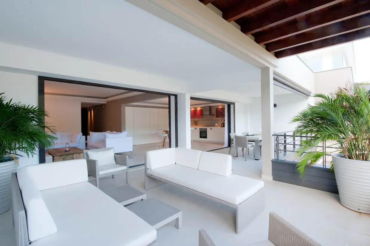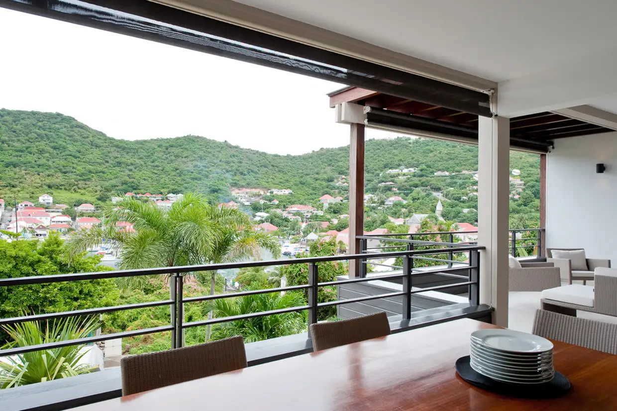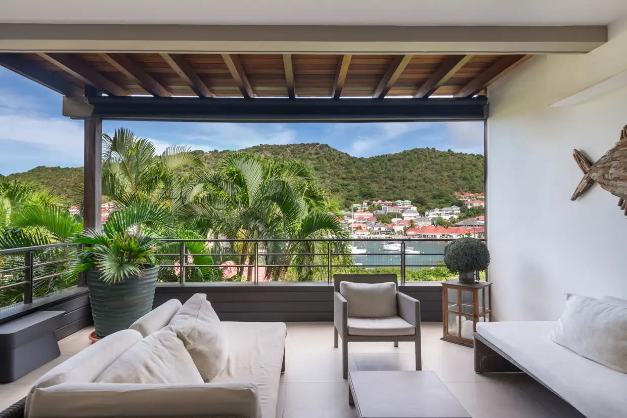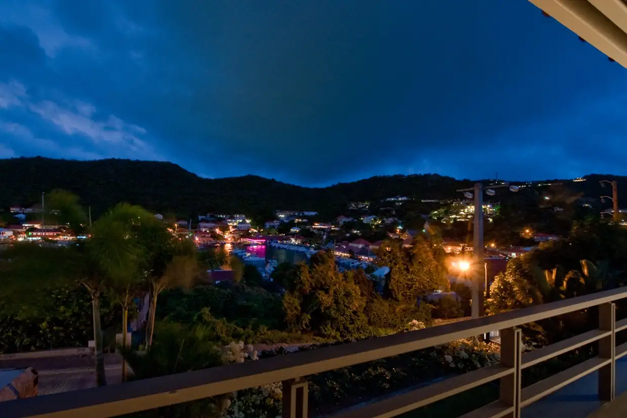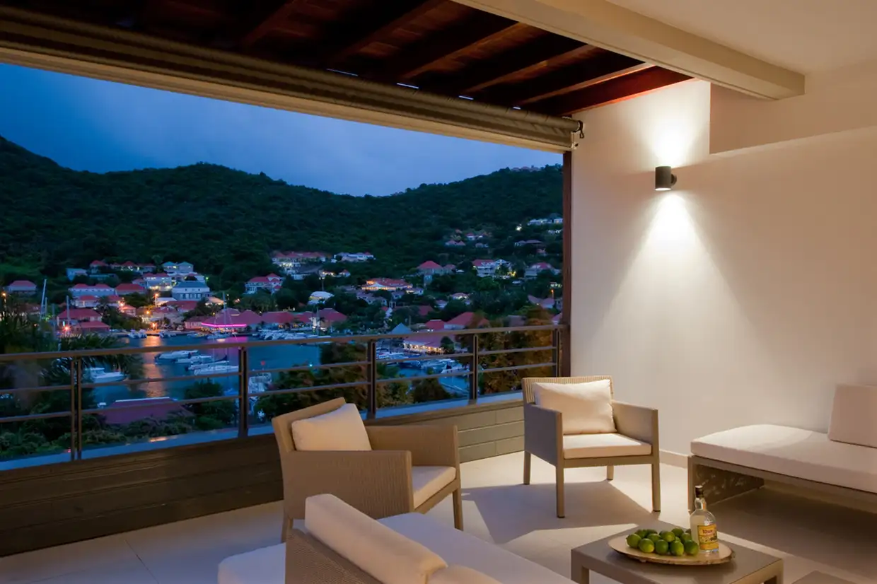 The terrace, arranged with lounge and dining areas, faces the harbor view, which is beautifully enhanced at night by the lights of Gustavia.