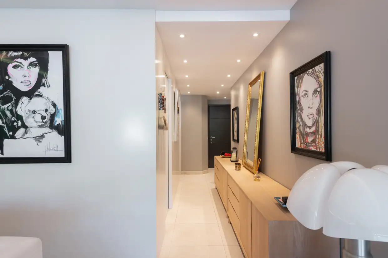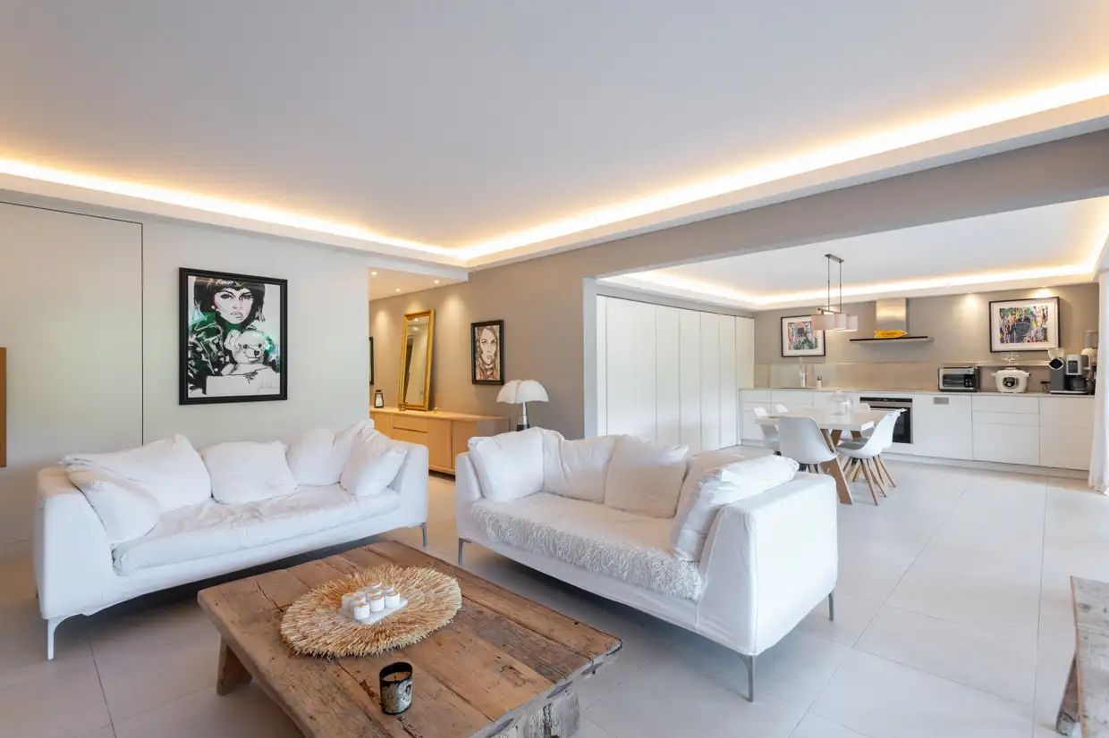 Designed with great attention to detail, the apartment features clean lines and offers all modern comforts. High-quality fittings and materials throughout add a touch of understated luxury. Very quiet, bright, and fully air-conditioned, this 1334.72 Sq Ft / 124 sqm apartment offers a well-appointed living area including a fully equipped, custom-designed kitchen, a dining area, and a comfortable living room. Numerous built-in storage spaces, discreetly integrated along the façade, as well as a guest restroom, complete this area.