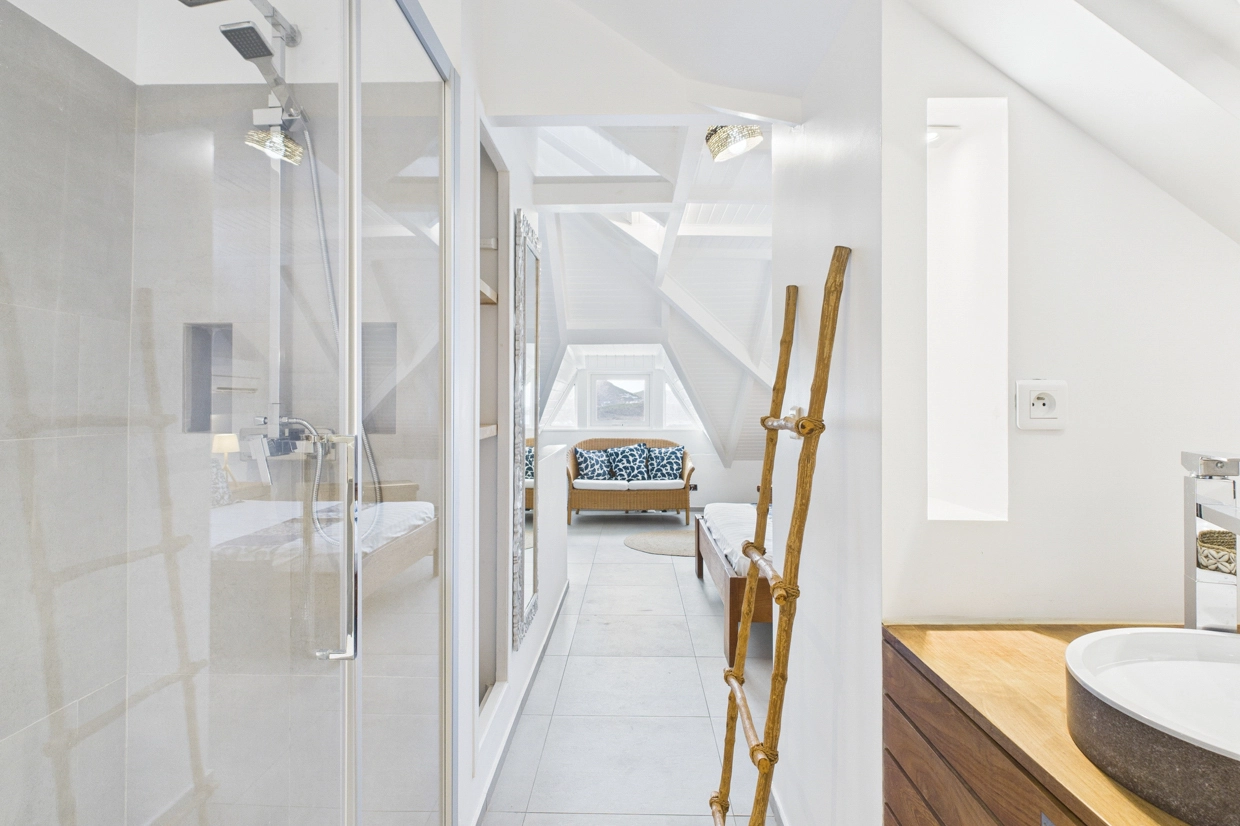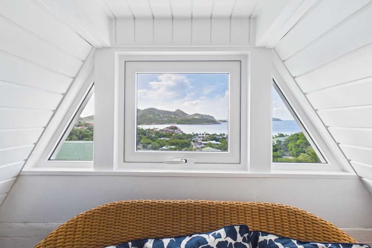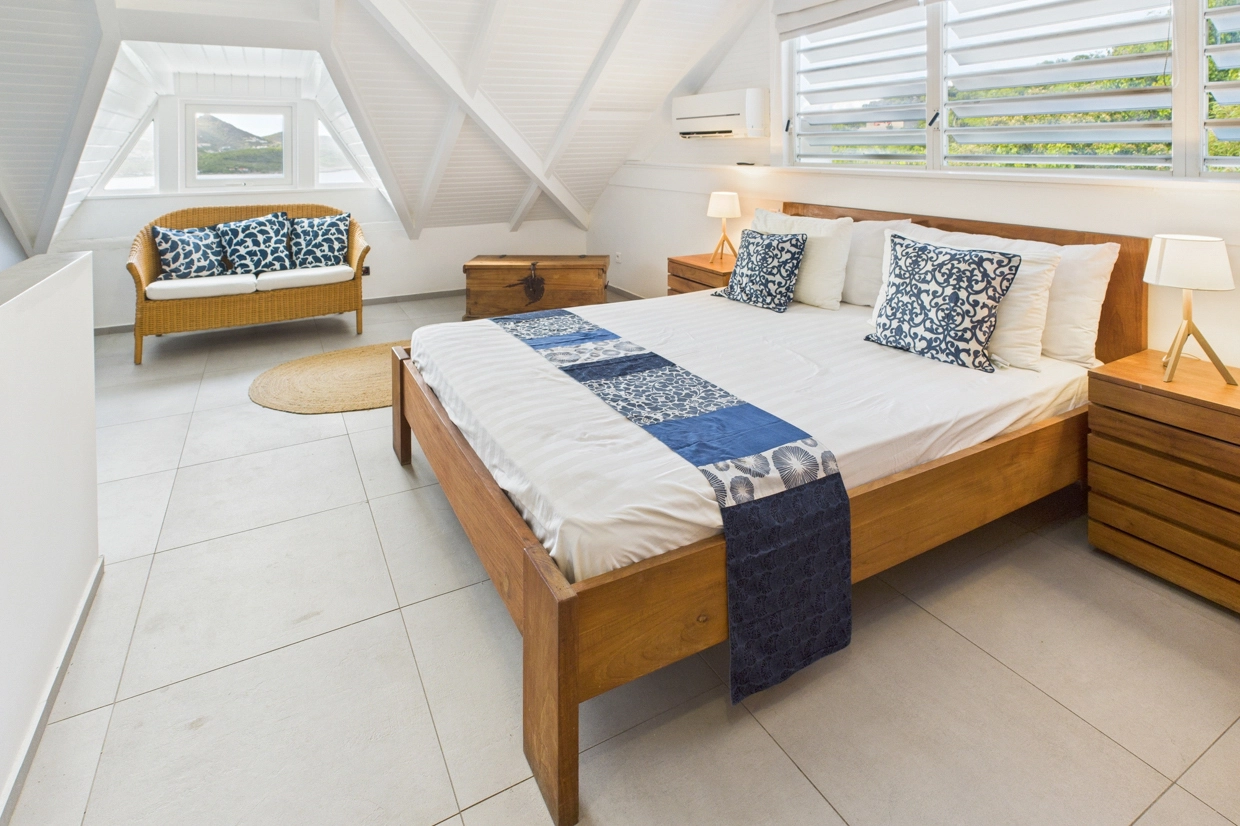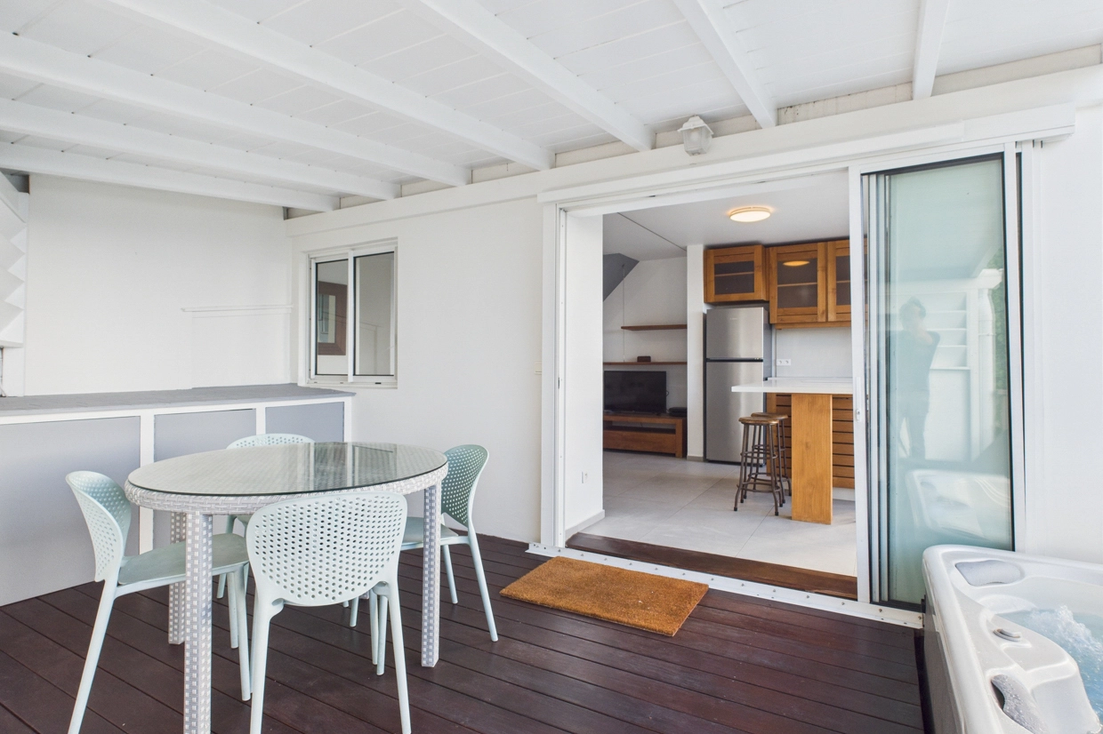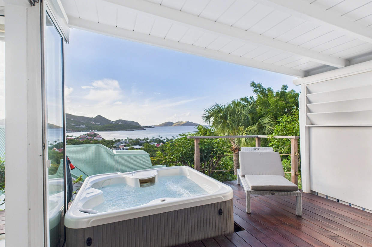 Warm and filled with natural light, this charming duplex features a pleasant living area with a lounge corner, a fully equipped kitchen, a dining nook, and a guest restroom. The main room opens onto a private terrace with a jacuzzi, offering a stunning view over Saint Jean Bay ; an ideal spot to relax and enjoy the island’s breezy ambiance. A staircase leads to the upper level, where a comfortable bedroom with an en-suite bathroom ensures both privacy and serenity.