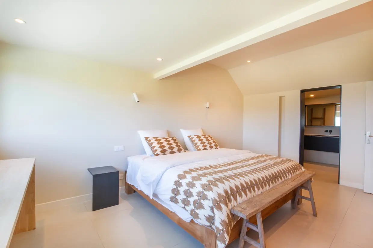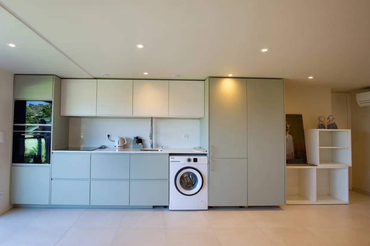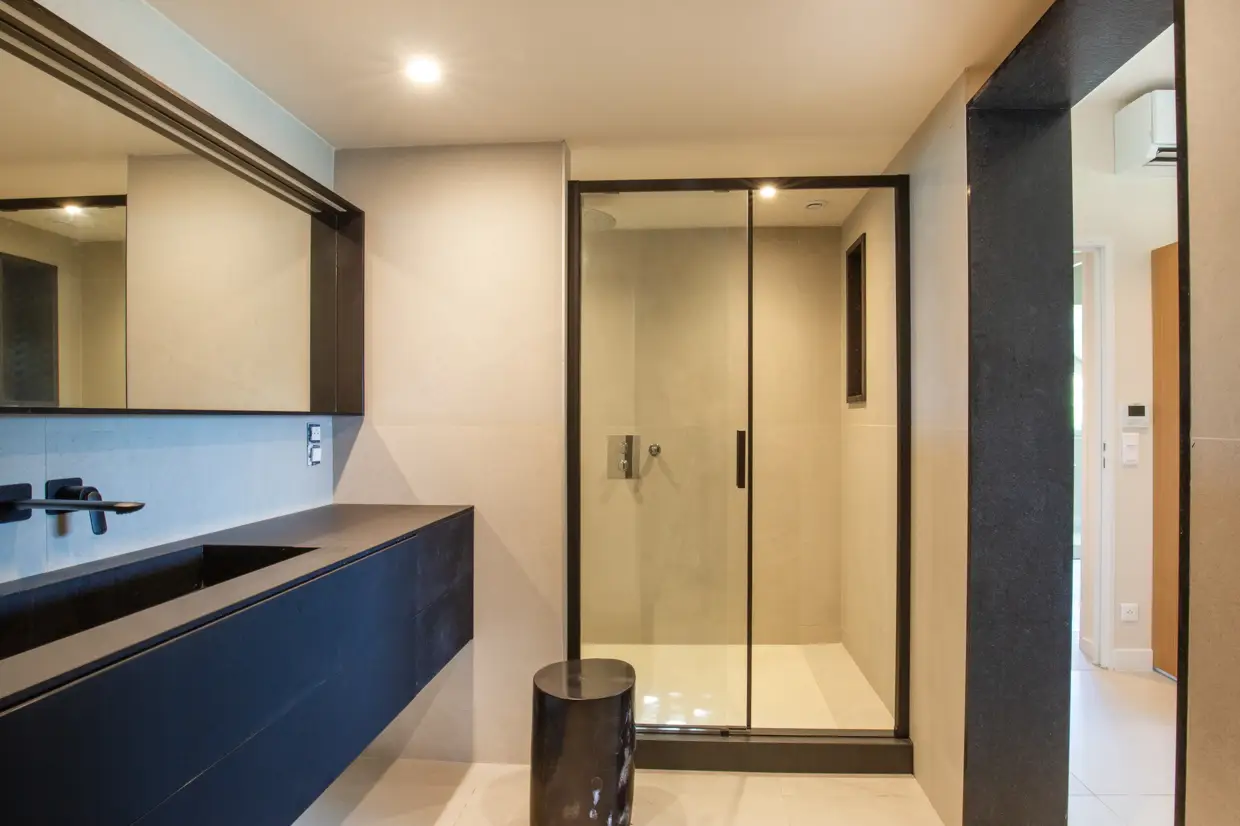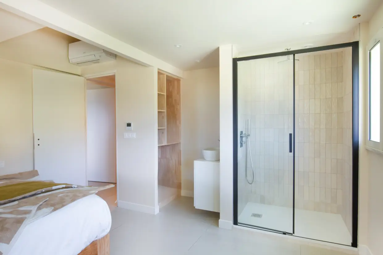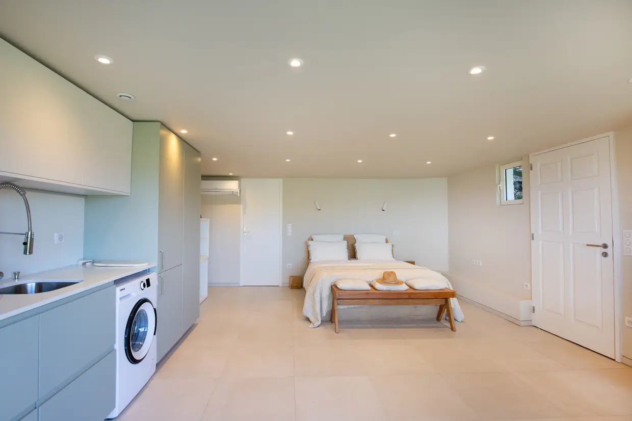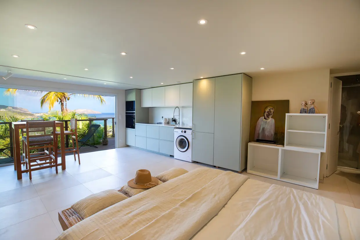 Accessible from the front terrace, the adjoining studio offers 441.32 sq ft / 41 sqm of living space with a shower room, dressing area, and its own terrace. Renovated in the same contemporary and minimalist style, it also enjoys stunning views over St Jean Bay.