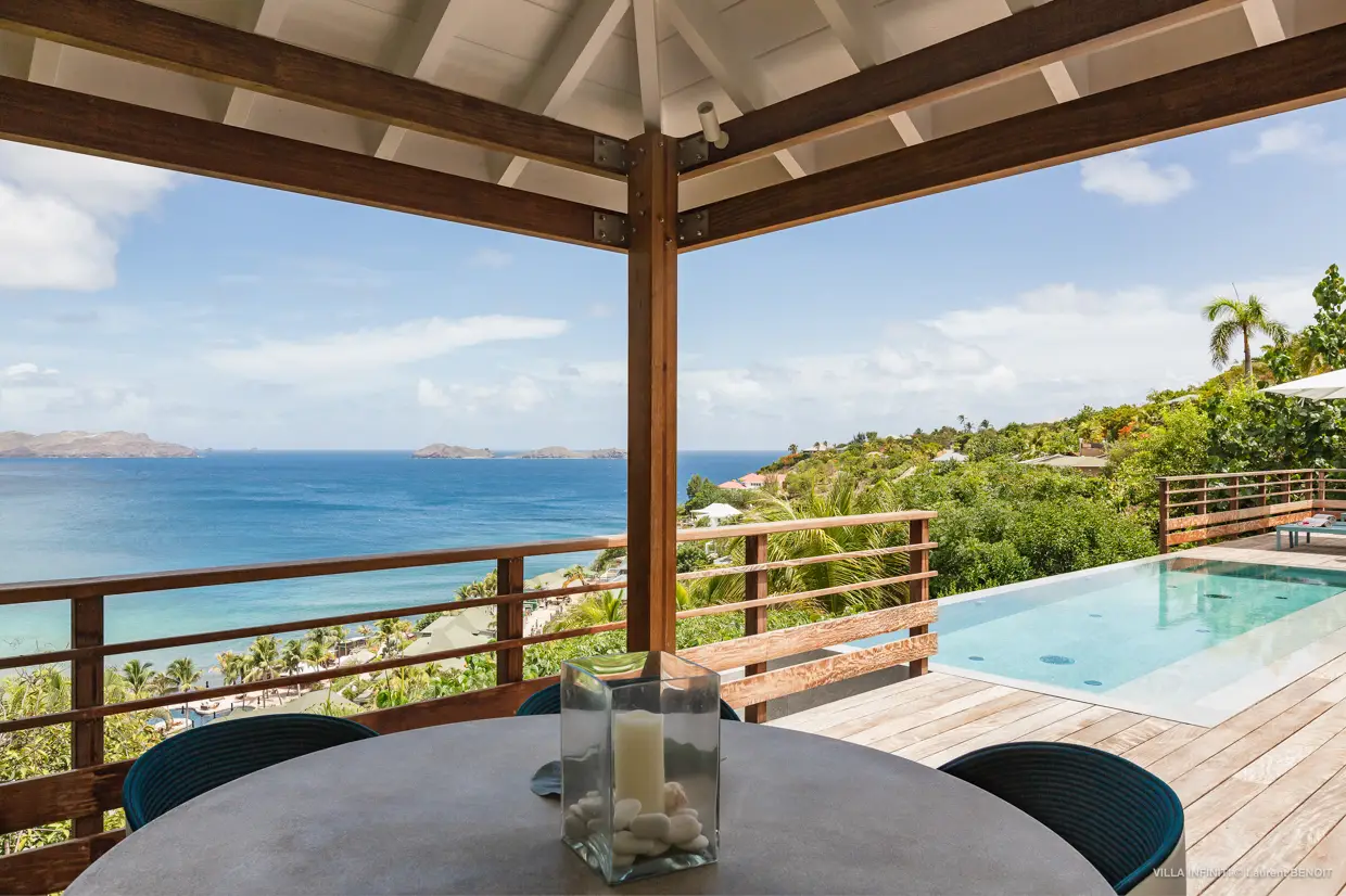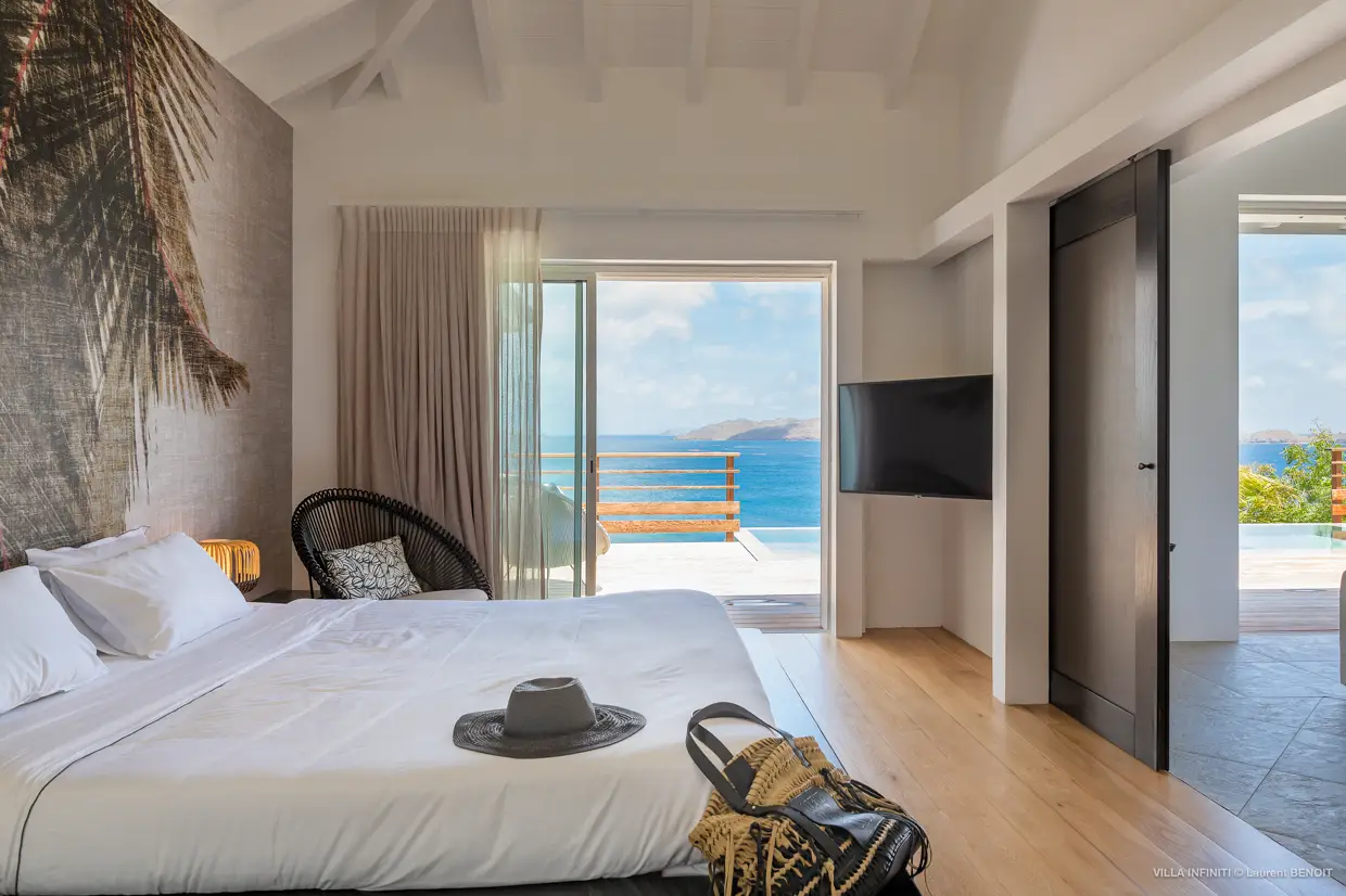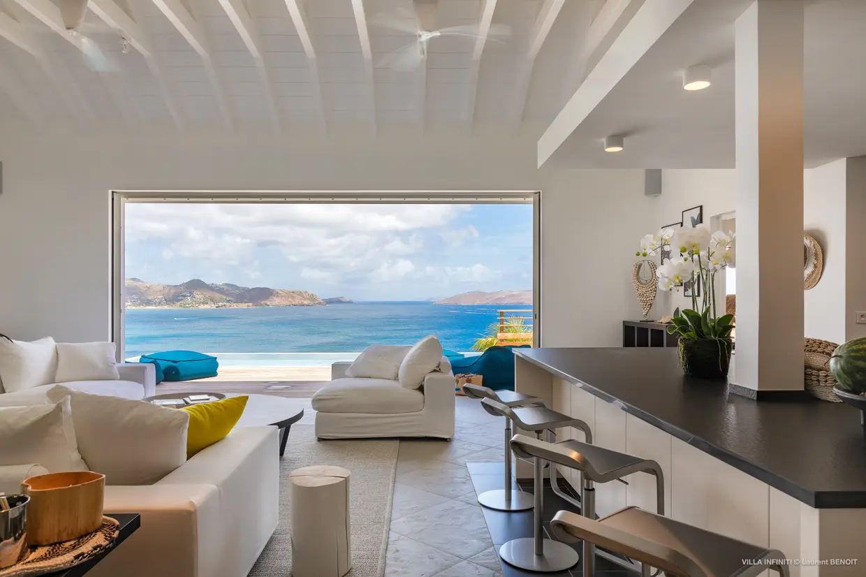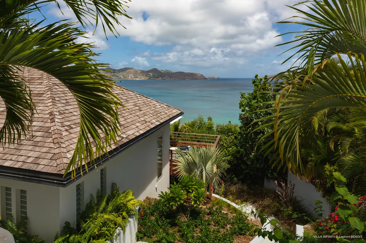 From the heights of Pointe Milou, Villa Infiniti captures the full beauty of its surroundings, offering stunning ocean views with the neighboring islets as a backdrop, and, by the end of the day, magnificent sunsets that gently transform the atmosphere.