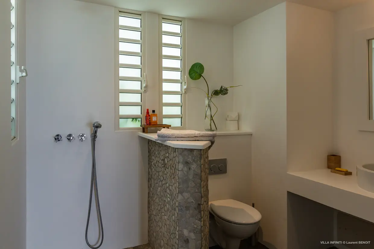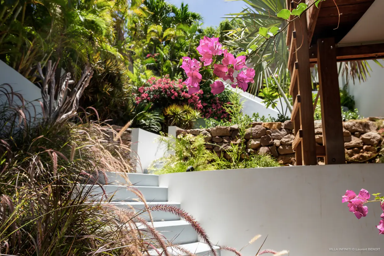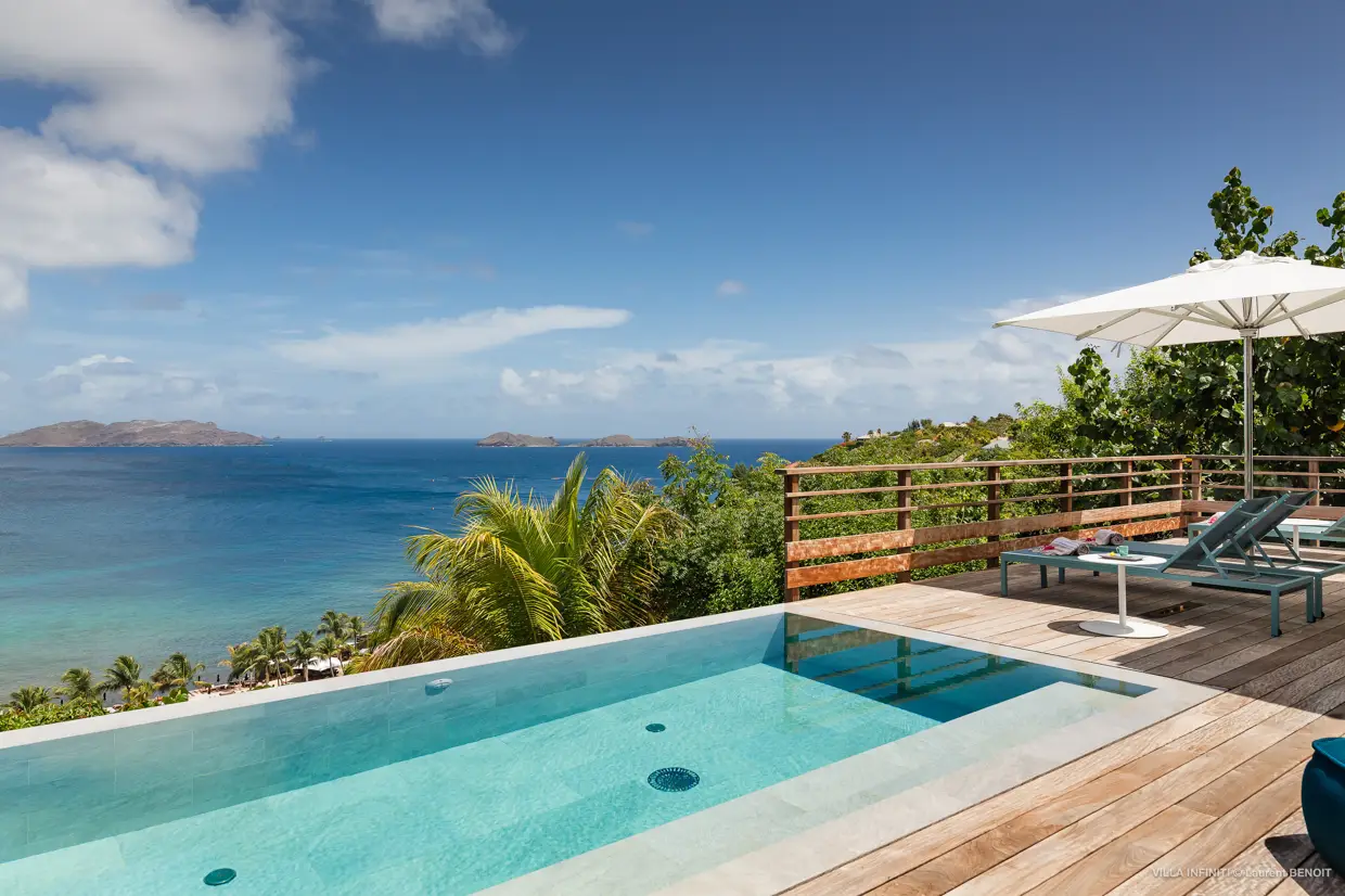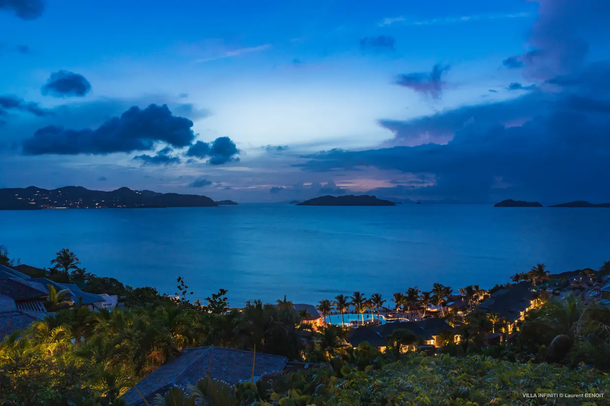 From the heights of Pointe Milou, Villa Infiniti captures the full beauty of its surroundings, offering stunning ocean views with the neighboring islets as a backdrop, and, by the end of the day, magnificent sunsets that gently transform the atmosphere.