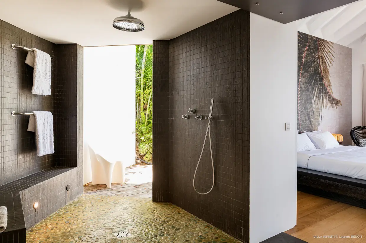 At the front, the terrace naturally extends the living space. The heated infinity pool appears to blend into the blue of the ocean, while the ajoupa shelters a pleasant dining area, ideal for enjoying the outdoors.