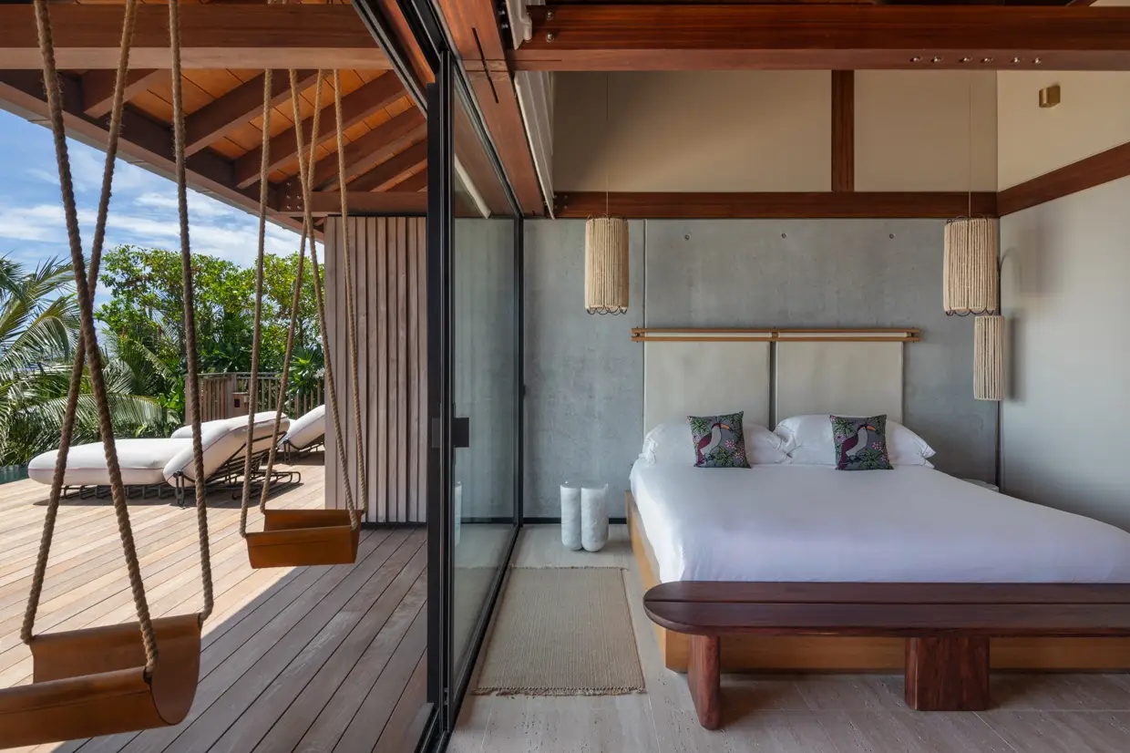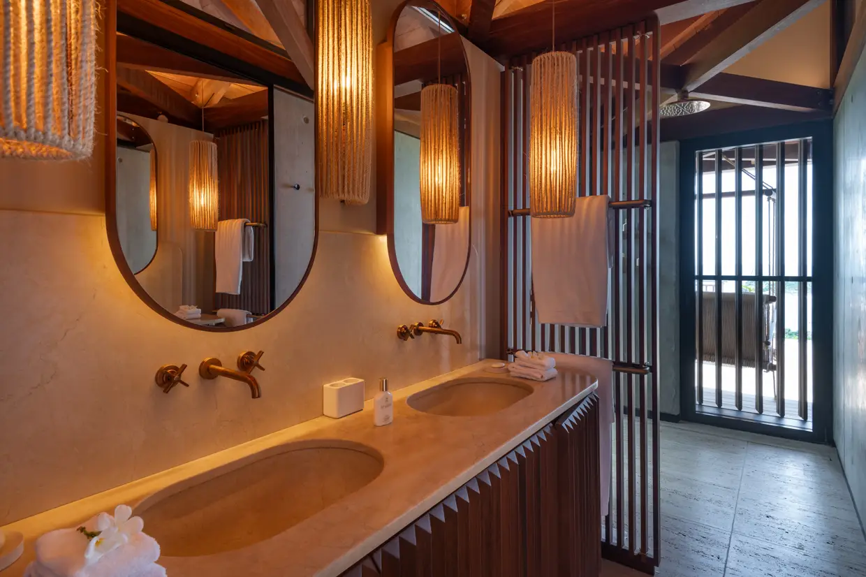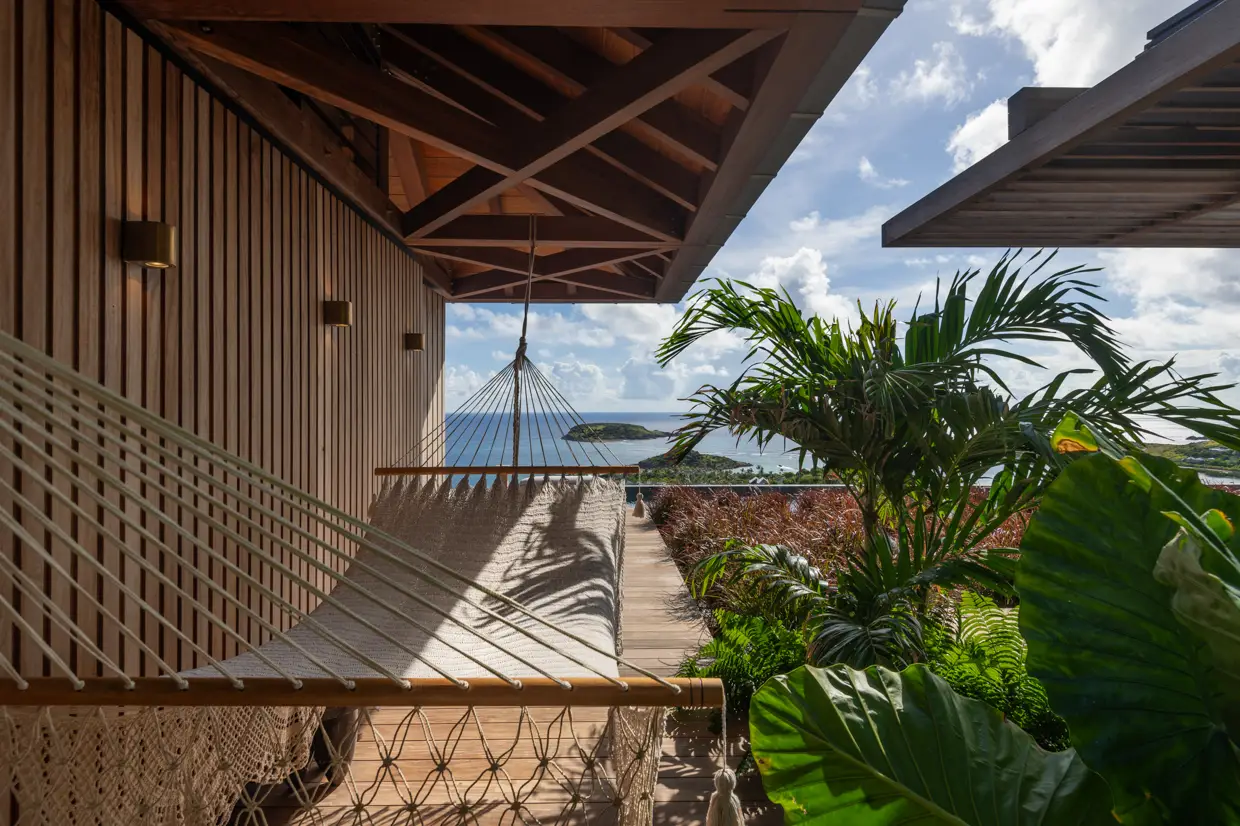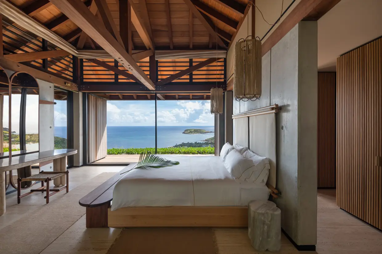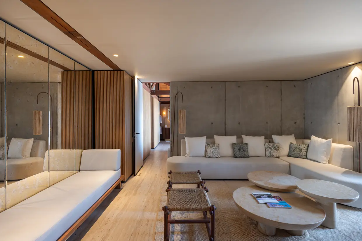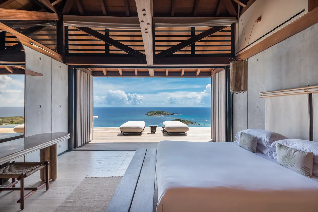 Le Manoir Voltaire, on the upper level, features an open, threshold-free architecture where air, light, and perspectives flow effortlessly. Concrete and wood create a minimalist yet warm atmosphere, with each space naturally extending outdoors. The expansive living area, with its seamlessly integrated kitchen, and four suites unfold along a vast deck bordering a 50-meter pool, the longest on the island, reflecting during the day the turquoise nuances of the bay below.