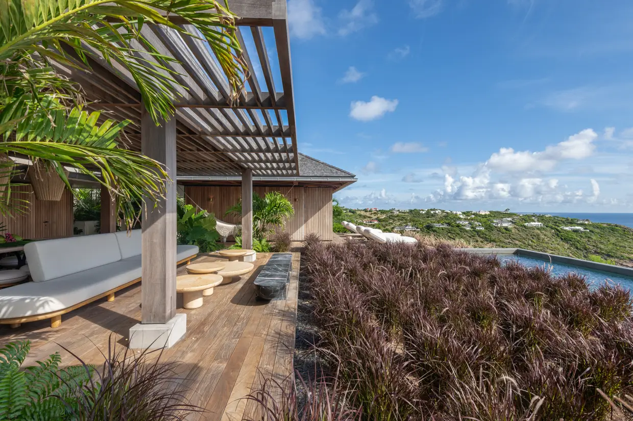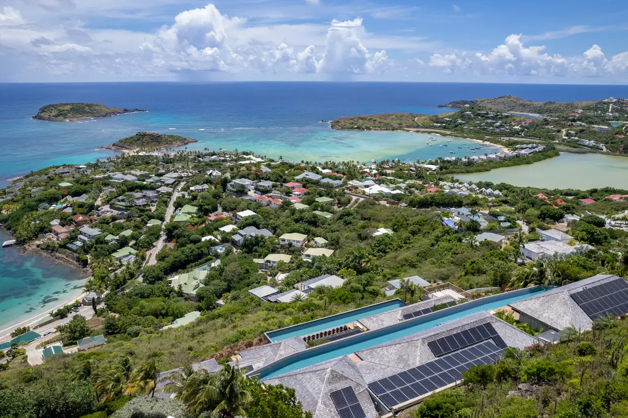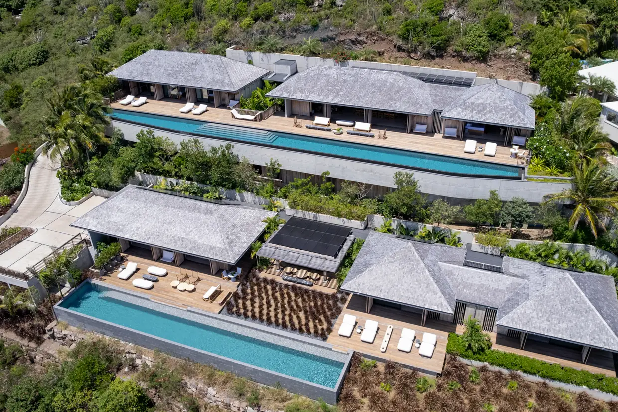 Set on an acre of land, the estate with monumental volumes offers 6000 sq ft of living space, conceived around a rare concept in Saint-Barth: a compound of two independent villas designed by architect Lorena GABALDON, totaling 9 bedrooms and accommodating up to 22 guests.