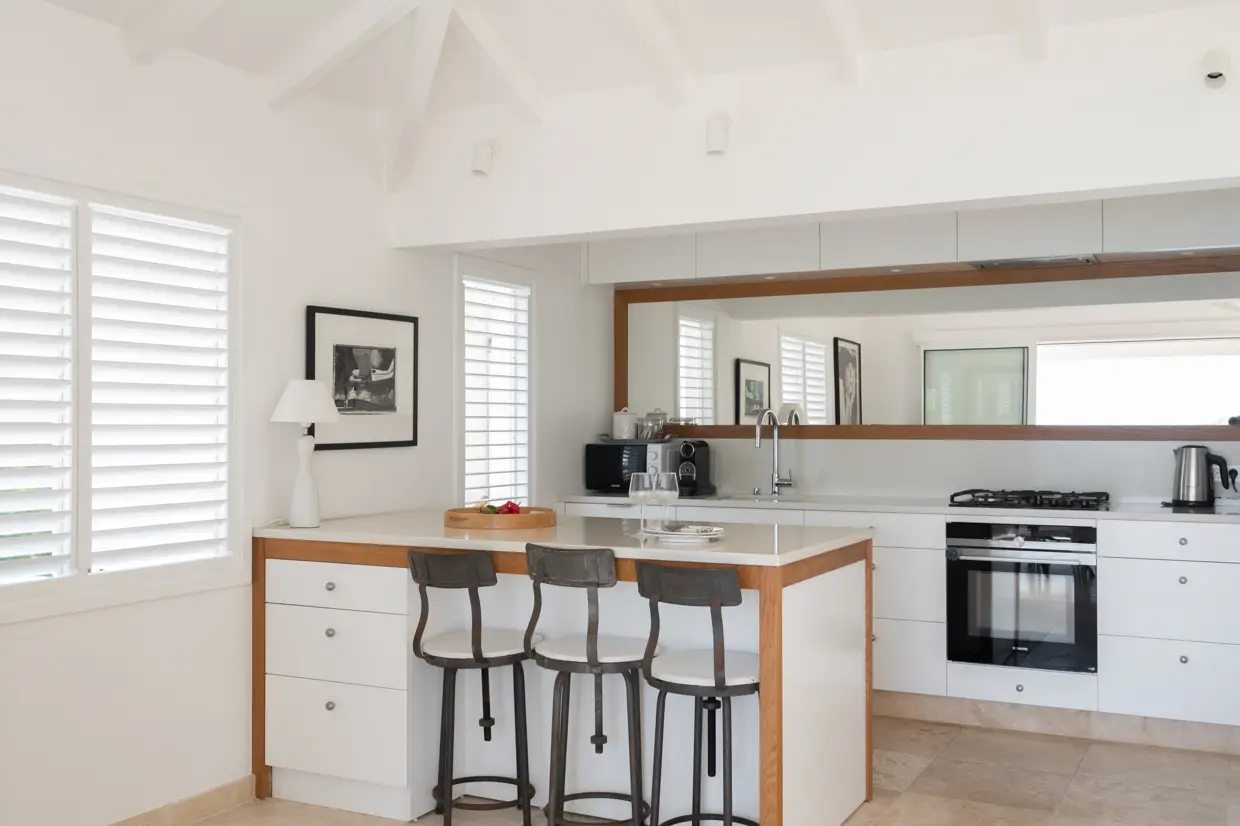 Spread over three levels, this charming Caribbean-inspired property was designed to make the most of the stunning views. The open living spaces are bathed in a soft, bright atmosphere, enhanced by a clean-lined decor accented with a few brightly colored paintings. The living room and fully equipped kitchen, featuring a bar-style island, create a welcoming space that extends onto a large terrace, complete with a shaded dining area and outdoor lounge facing the bay.