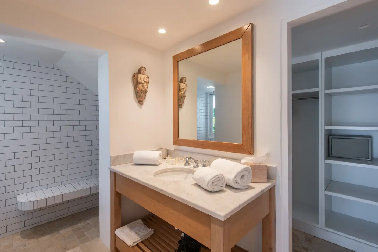 The villa offers three bedrooms, each with its own en-suite bathroom, combining comfort and privacy. All three enjoy beautiful sea views. One is located in a separate bungalow, another opens directly onto the main terrace, and a third, accessible via an exterior staircase, is situated on the intermediate level with its own private terrace surrounded by tropical vegetation.