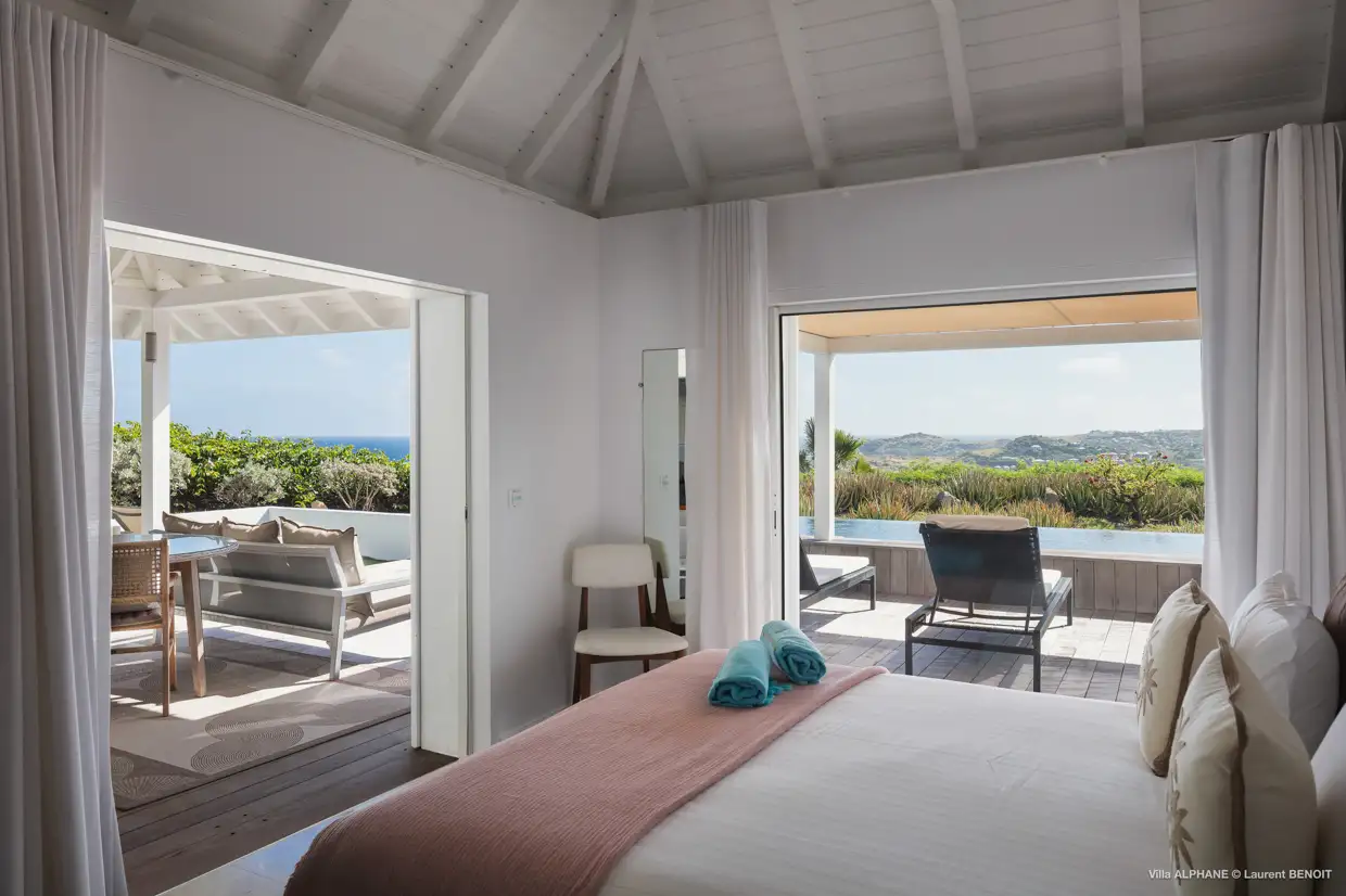 Villa Arrow Marine stands out with its arched architecture, which provides a double exposure from every room. Two terraces shape the outdoor living spaces: one features a large curved pool bordered by lounging areas, while the other opens directly onto the sea. Inside, the contemporary living room boasts generous volumes—high ceilings, clean lines, and soft tones create a warm, inviting atmosphere. The fully equipped kitchen, complete with a convivial bar, flows naturally into the outdoor dining area.