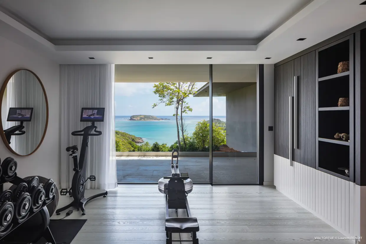 On the upper floor, the master suite and its private terrace face the bay. A little lower, two additional suites are arranged, one of which has been converted into a gym and also features a beautiful terrace.