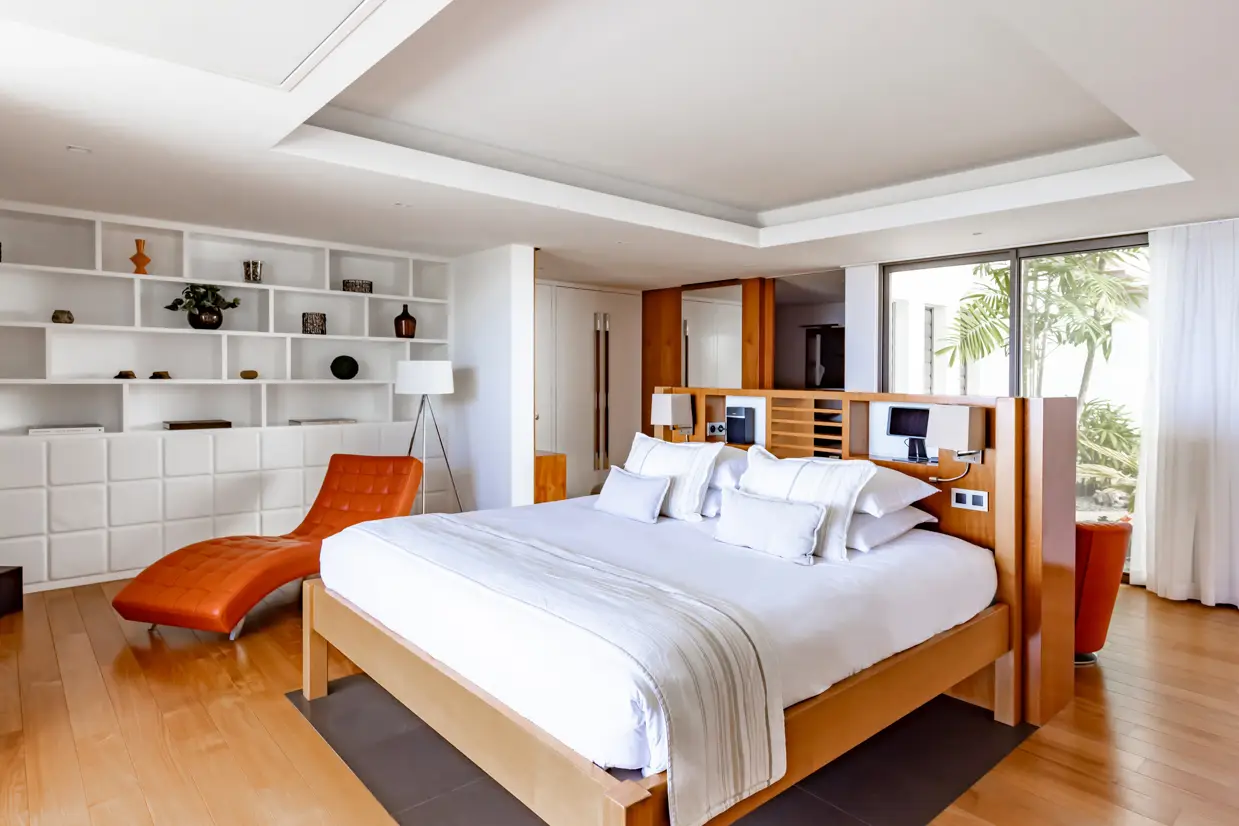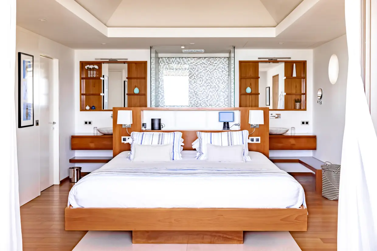 The sleeping quarters consist of three bedrooms spread across different levels, each offering a true cocoon of tranquility. Each room has its own private terrace with a jacuzzi, an exclusive space to take in the idyllic panorama in complete privacy.